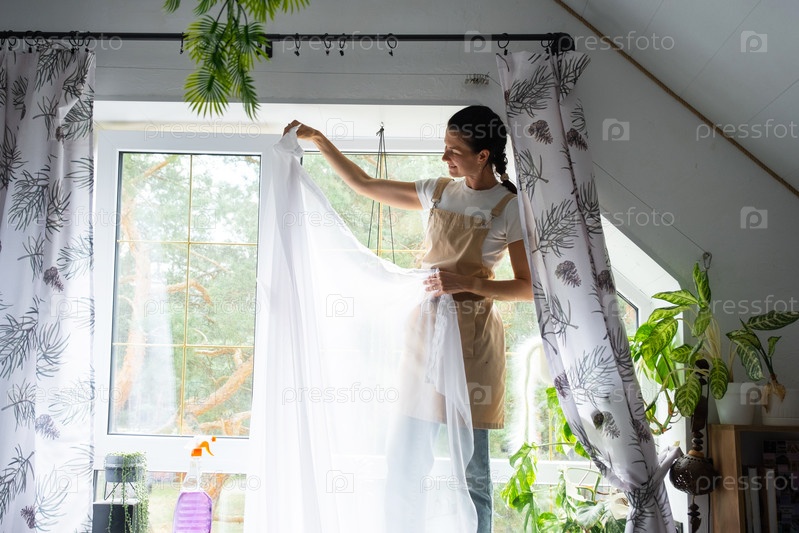 Женщина в фартуке вешает прозрачные тюльские шторы на большие чердачные окна в доме внутри интерьера с горшечными растениями. Весенняя уборка, уборка