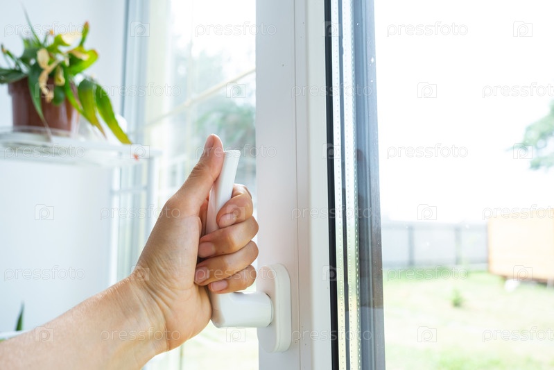 Рука держит рукоятку пластикового стеклопакета, закрывая и открывая окно поворотным механизмом, положение рукоятки для вентиляции, микровентиляции