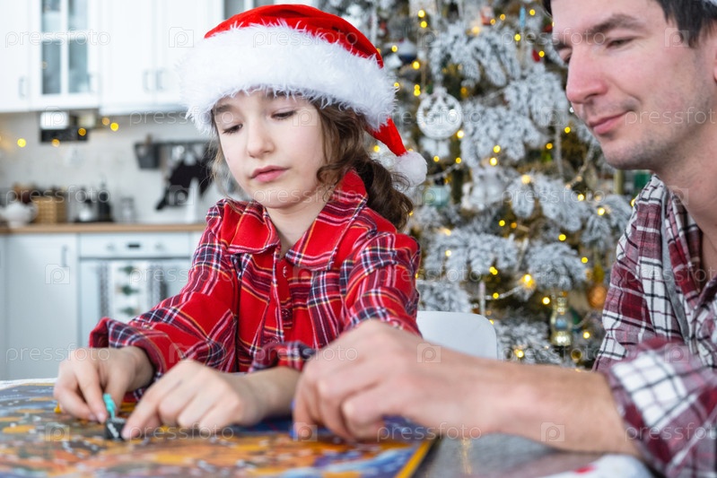Счастливая семья папы и дочери в праздничных шляпах Санта играет в настольную игру за столом на белой кухне с елкой и декором. Новый год, семейные ценности