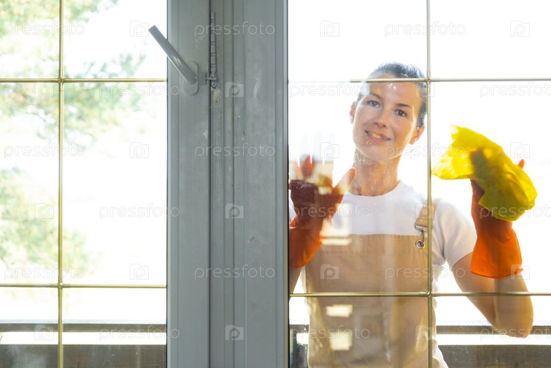 Женщина в резиновых перчатках и фартуке вручную моет оконный балкон дома тряпкой и шваброй снаружи за стеклом. Восстановление порядка и чистоты весной, уборка сервиза