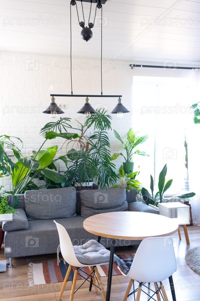 Современный дом в стиле лофт с большими горшечными растениями, серым диваном, пустым круглым столом, полосатым ковром и большими окнами