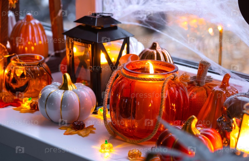 Праздничный декор дома на подоконнике к Хэллоуину - тыква, Джек о фонари, черепа, паутина, пауки, скелеты, свечи и гирлянда - уютное и страшное настроение