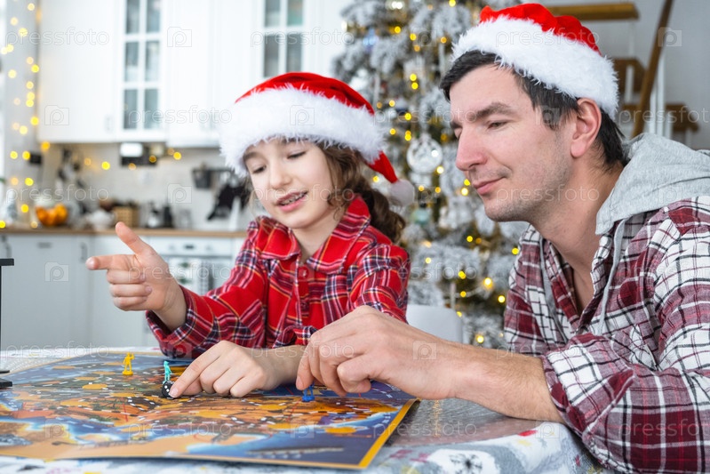 Счастливая семья папы и дочери в праздничных шляпах Санта играет в настольную игру за столом на белой кухне с елкой и декором. Новый год, семейные ценности