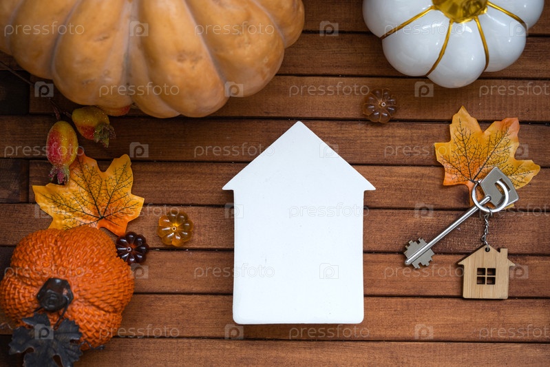 Уютный макет дома высмеивают на деревянном фоне планок с тыквами, осенними листьями, домом и ключами - осеннее настроение, Хэллоуин, жилье, переселение, ипотека, страхование