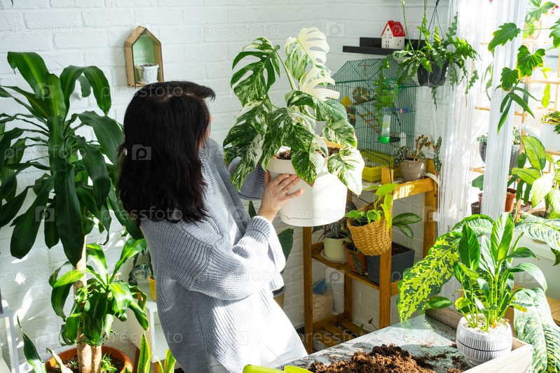 Женщина держит дома растение редкого варегатного монстра Альба в горшке в домашнем интерьере