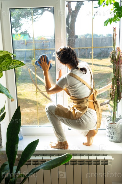 Женщина в фартуке вручную моет окно дома тряпкой и шваброй внутри интерьера с домашними растениями на подоконнике. Восстановление порядка и чистоты весной, уборка сервиза