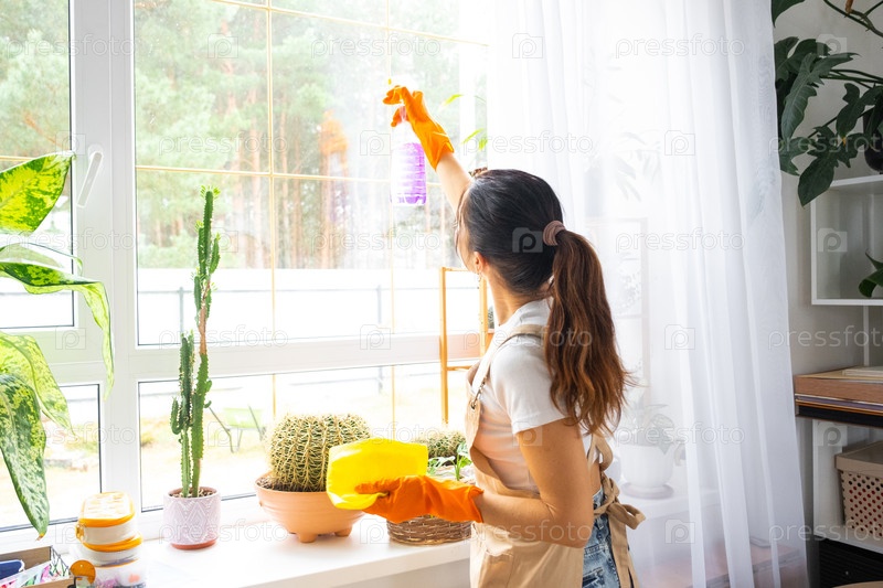 Женщина в резиновых перчатках и фартуке вручную моет окно дома тряпкой и шваброй внутри интерьера с домашними растениями на подоконнике. Восстановление порядка и чистоты весной, уборка сервиза