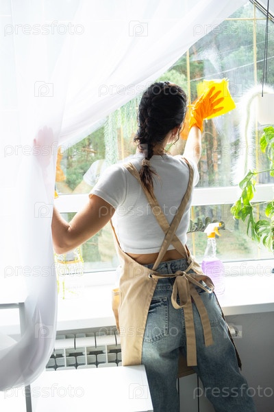 Женщина в резиновых перчатках и фартуке вручную моет окно дома тряпкой и шваброй внутри интерьера с домашними растениями на подоконнике. Восстановление порядка и чистоты весной, уборка сервиза
