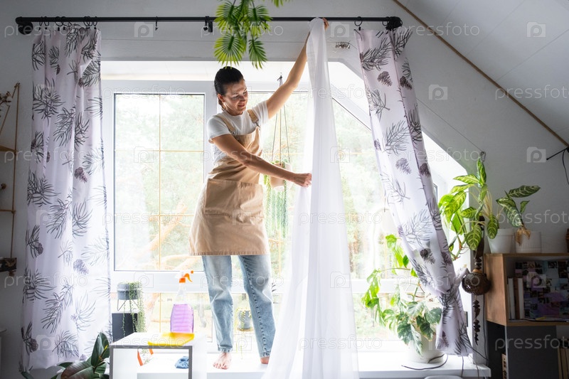 Женщина в фартуке вешает прозрачные тюльские шторы на большие чердачные окна в доме внутри интерьера с горшечными растениями. Весенняя уборка, уборка