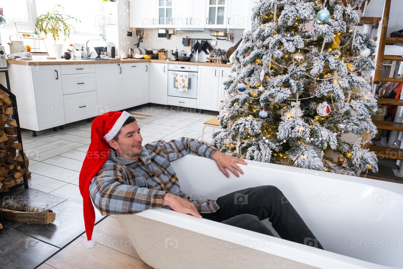 Человек в шляпе Санта лежит отдыхающим в Новой ванне под елкой в качестве новогоднего подарка в интерьере белой декорированной кухни. Реконструкция и дизайн интерьера, строительство и улучшение дома