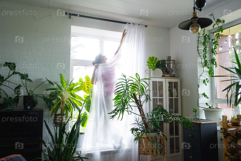 Женщина вешает прозрачные тюльские шторы на большие окна в доме внутри интерьера. Весенняя уборка, уборка