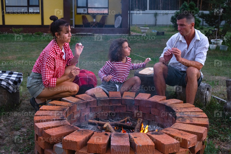 Семья мама, папа, дочь жарят зефир на шашлыках на костре в очаге во дворе дома у пожарной ямы уютным летним вечером