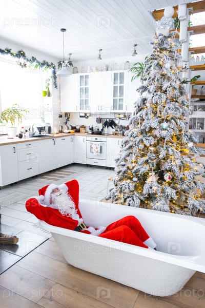 Санта лежит отдыхая в Новой ванне под праздничной елкой в качестве новогоднего подарка в интерьере белой современной декорированной кухни. Реконструкция и дизайн интерьера, строительство и улучшение дома
