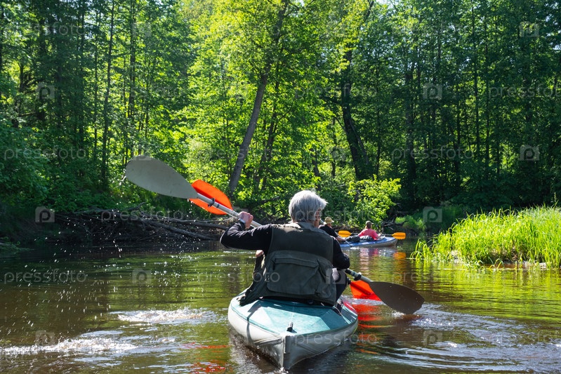 Групповая поездка на байдарках для сеньора и сеньоры. Пожилая пара и взрослая гребная лодка на реке, поход по воде, летнее приключение. Возрастные виды спорта, умственная молодость и здоровье, туризм, активная старость