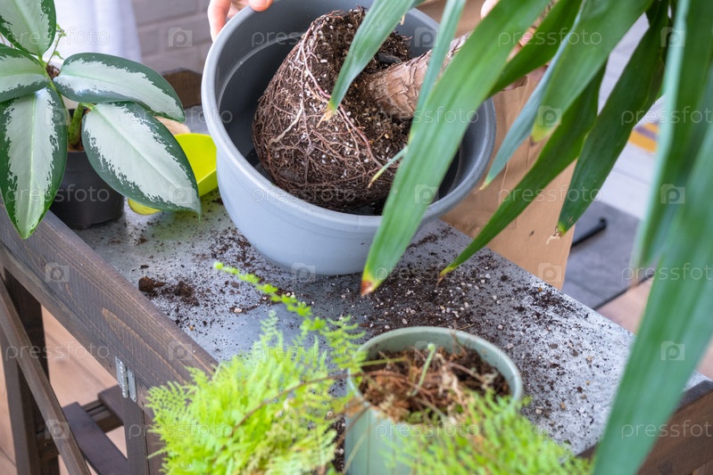 Пересадка и уход за домом растения Юкка в новый горшок в интерьере дома. Женщина разводит и выращивает растения хобби, держит тропическое растение Дракена