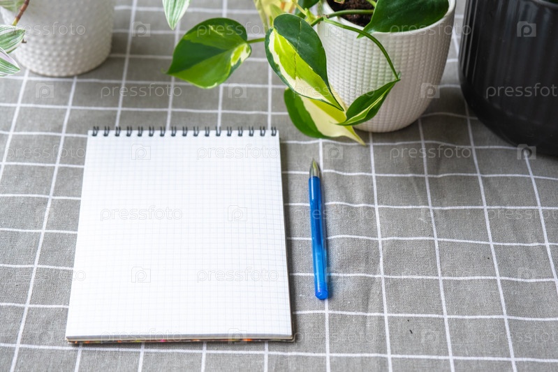 Пустой макет ноутбука с ручкой на столе с домашними горшечными растениями. Рекомендации по учету ухода за растениями