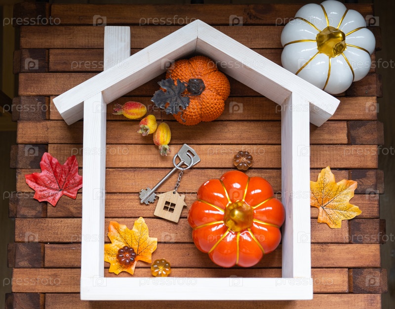 Уютная планировка на деревянном фоне планок с тыквами, осенними листьями, домом и ключами - осеннее настроение, Хэллоуин, жилье, переселение, ипотека, страхование