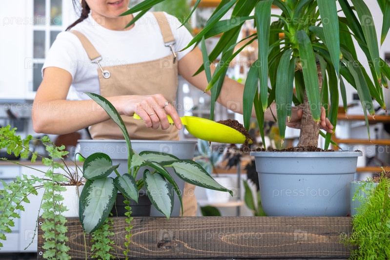 Пересадка и уход за домом растения Юкка в новый горшок в интерьере дома. Женщина разводит и выращивает растения хобби, держит тропическое растение Дракена