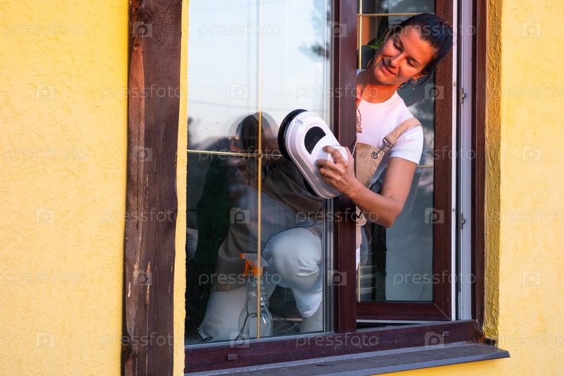 Женщина запускает робота-уборщика окон дома снаружи с желтым фасадом. Домашняя робототехника, домашний помощник, уборка сервиза
