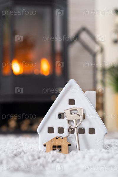 Ключ к дому с брелоком на фоне каминной плиты с огнем и дровами в декоре Valentine, любовь к дому. Переезд в новый дом, ипотека, аренда и покупка недвижимости
