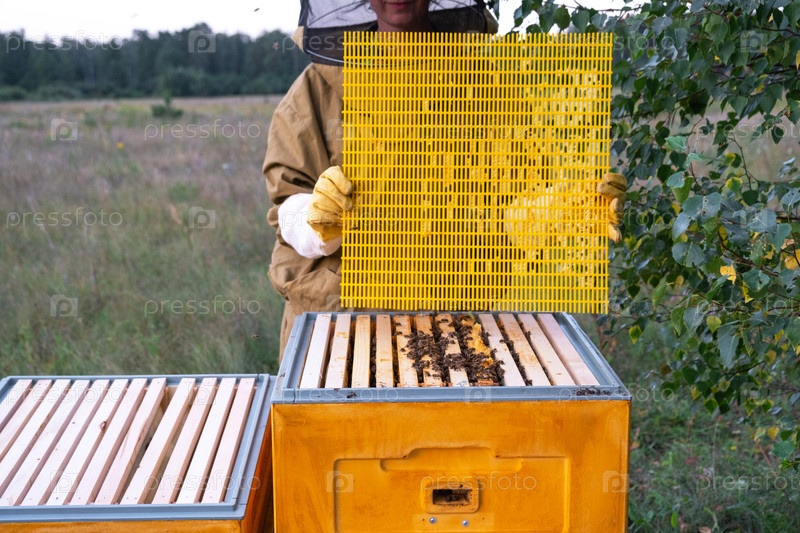 Пчеловод, женщина в защитном костюме от укусов пчел, устанавливает разделительную решетку в улье. Пчеловодство, уход за ульем