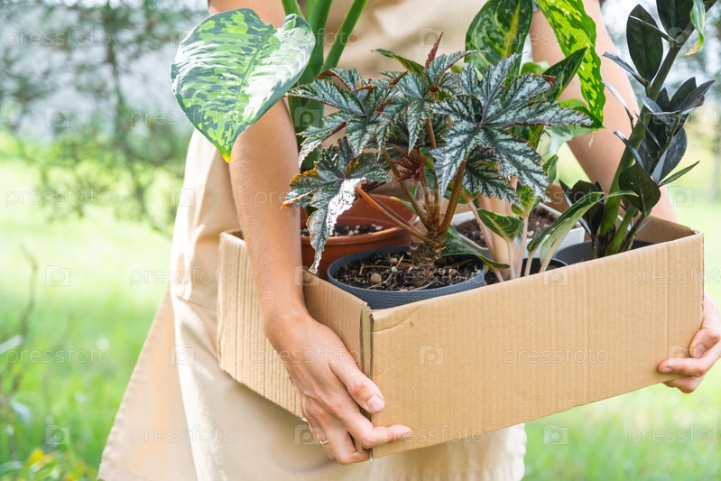 Флорист упаковывает комнатные растения в коробку для доставки покупателю. Продажа, безопасная отправка растений из магазина, посылка. Цветочный магазин, домашний малый бизнес, питомник