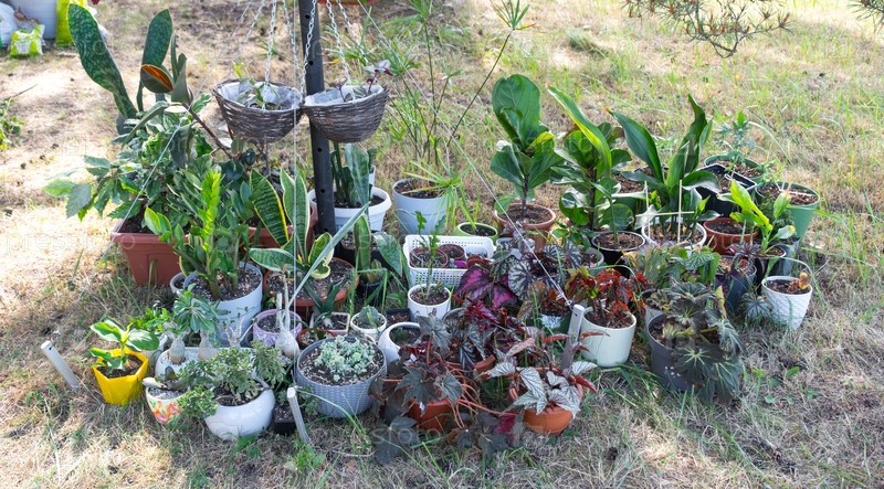 Домашние тропические растения — это группа, выходящая на улицу летом, чтобы ускорить рост. домашние растения в горшках в саду