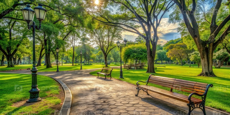 Городской парк с деревьями и скамьями. Генерирующий ИИ