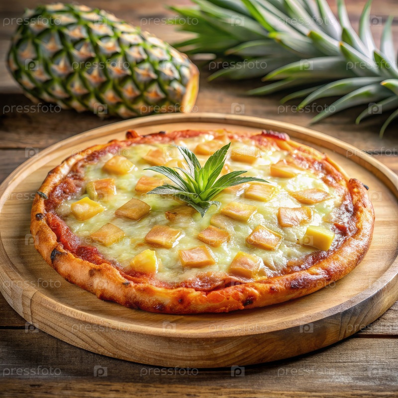 Ананасовая пицца на деревянной плите. Генерация AI