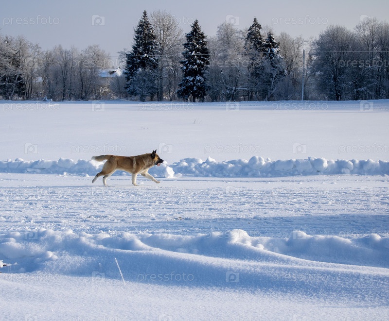Собака бежит по зимней дороге