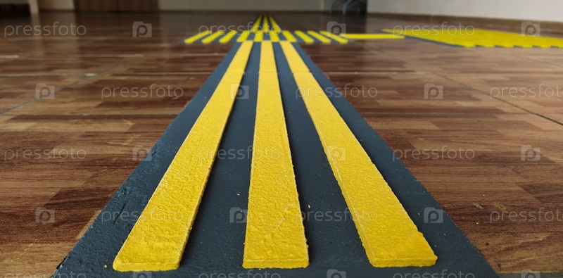 Желтая тактильная плитка на полу. Разметка для удобства слабовидящих людей