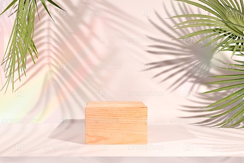 Пустой деревянный подиум для косметики отображается на элегантном, солнечном, красочном баннере на фоне длинных теней пальмового листа. Идеальный шаблон для вашей творческой работы, концепция летней вечеринки