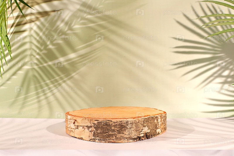 Пустой березовый подиум для косметики отображается на элегантном, солнечном, красочном баннере на фоне длинных теней пальмового листа. Идеальный шаблон для вашей творческой работы, концепция летней вечеринки