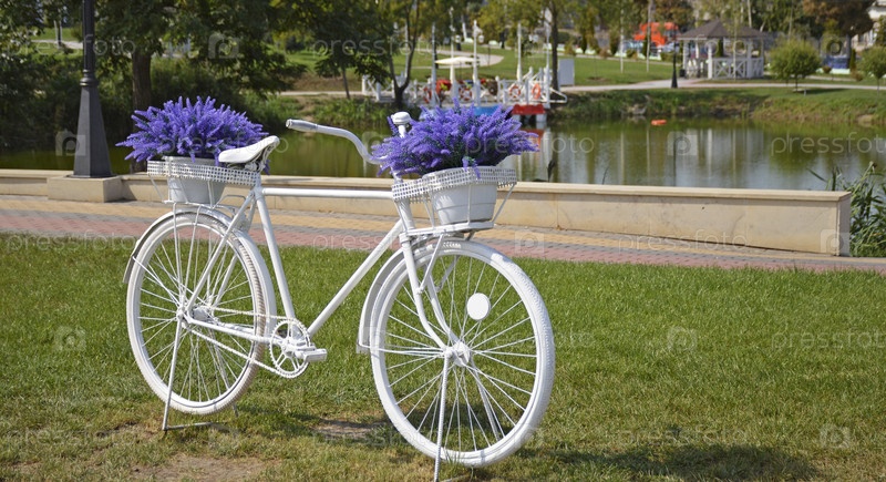 Декоративный велосипед с корзинами цветов. украшение газонов в городских парках и скверах. ландшафтный дизайн и декорации. место для фото. красота в природе