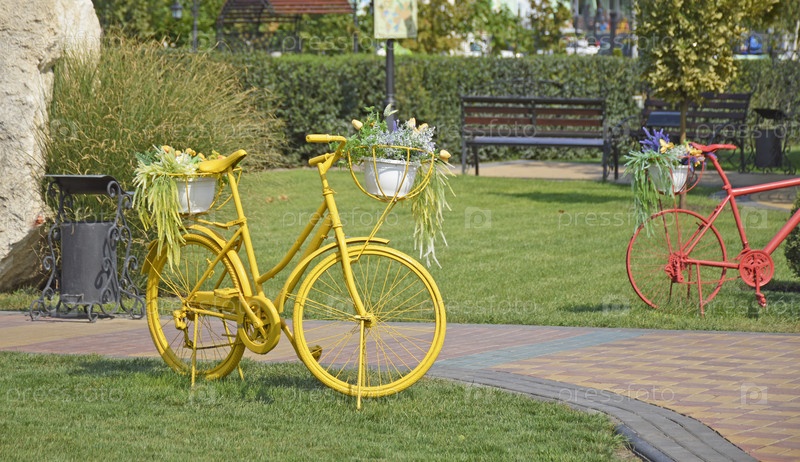 Декоративный велосипед с корзинами цветов. украшение газонов в городских парках и скверах. ландшафтный дизайн и декорации. место для фото. красота в природе