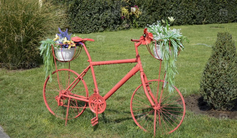 Декоративный велосипед с корзинами цветов. украшение газонов в городских парках и скверах. ландшафтный дизайн и декорации. место для фото. красота в природе
