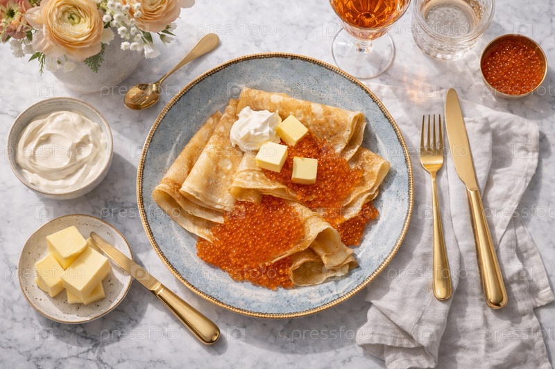 Элегантная сервировка: тонкие блины с красной лососевой икрой, кубиками сливочного масла и сметаной на голубой тарелке, золотые приборы на мраморном столе — праздничный завтрак в стиле русской кухни