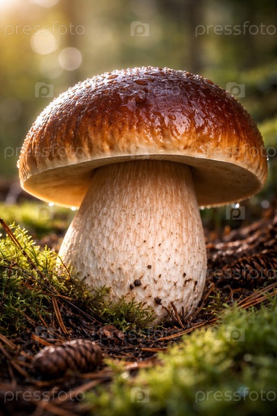 Белый гриб (боровик, Boletus edulis) в хвойном лесу — крупный план на мху с каплями росы и теплым утренним боке