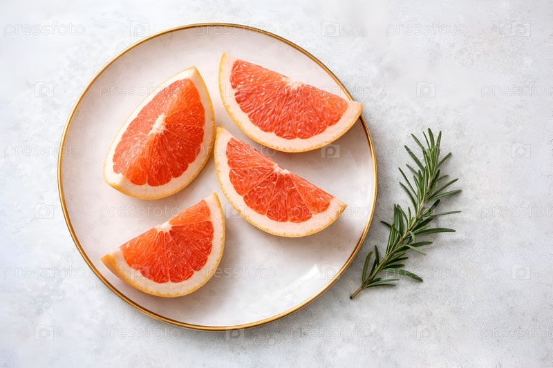 Крупный план дольки розового грейпфрута на фарфоровой тарелке с золотой каймой и веточкой розмарина на светлом мраморном фоне — минималистичная фуд-композиция для здорового завтрака и гастрономической съемки
