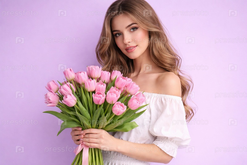 Женственный портрет: молодая женщина в белом платье с открытыми плечами держит большой букет розовых тюльпанов на пастельном лавандово-розовом фоне — весеннее настроение и нежная цветочная эстетика