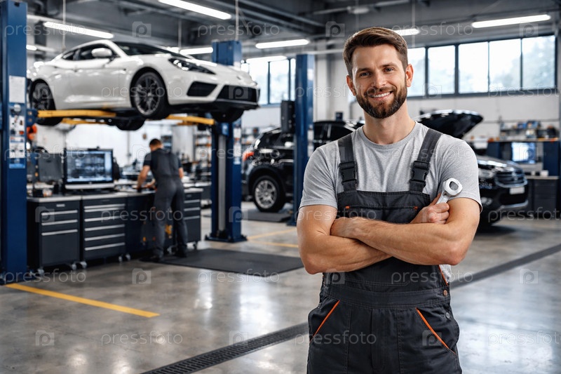 Автомеханик в спецодежде со скрещенными руками и гаечным ключом в современном автосервисе на фоне поднятого спортивного автомобиля и рабочих постов