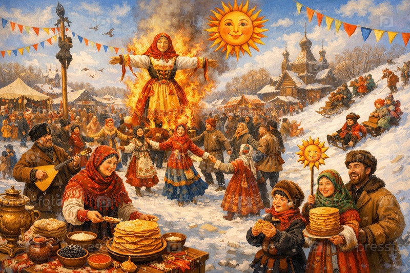 Масленица в русской деревне: красочное народное гуляние — чучело Масленицы в ярком сарафане, праздничные блины, сани с детьми, гармошка и костер на заснеженной деревенской площади с куполами церкви и старинной смотровой башней на заднем плане
