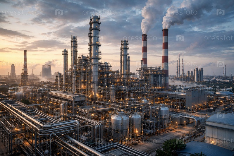 Панорамный вид завода при закате: сложная сеть трубопроводов, перегонные колонны, резервуары и дымящиеся трубы на индустриальном ландшафте