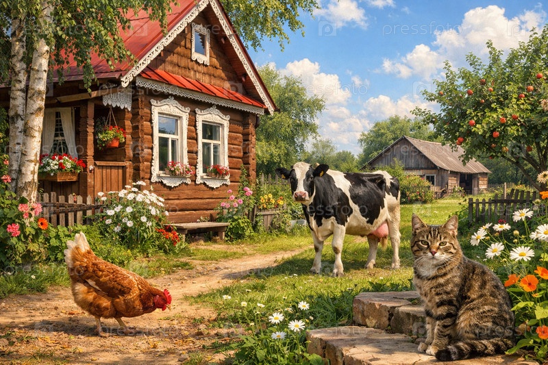 Идиллическая летняя сцена в русской деревне: деревянная изба с резными наличниками, цветущий сад, яблоня и старый сарай на заднем плане, корова, курица и кот на приусадебном подворье