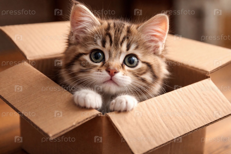 Очаровательный полосатый котенок в картонной коробке — крупный план портрета с большими выразительными глазами и пушистыми лапками в теплом мягком свете