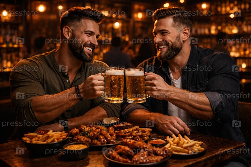 Двое друзей чокаются кружками пива за столом в уютном баре с тарелками куриных крыльев, картофеля фри, кренделей и соусов на фоне теплого боке и барной стойки — дружеская вечерняя встреча в пабной атмосфере
