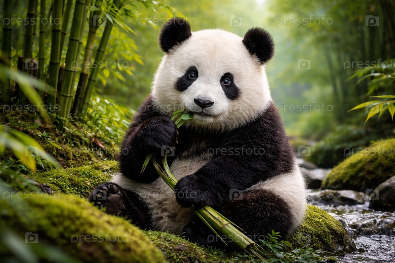 Гигантская панда — милый детеныш, сидящий в бамбуковом лесу у ручья и поедающий стебли бамбука, крупный план пушистого медвежонка в естественной зеленой среде