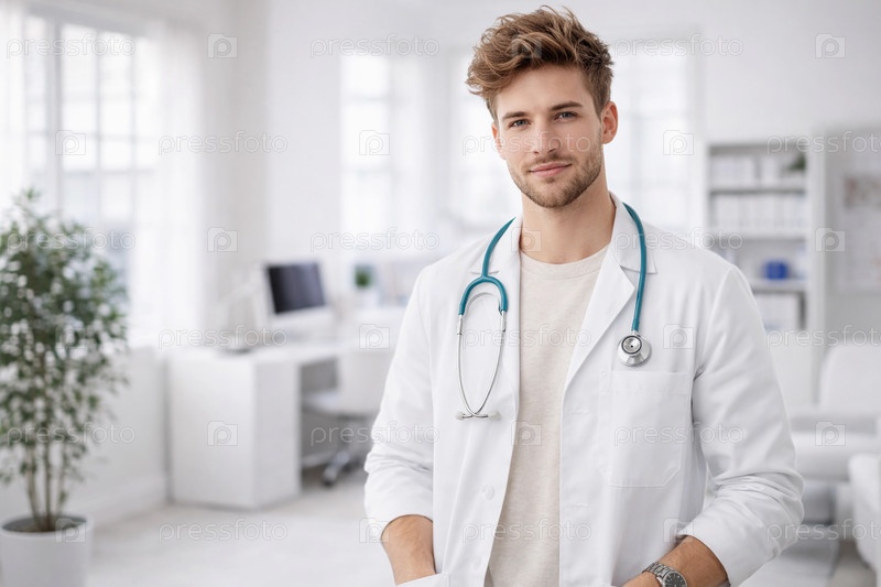 Молодой мужчина‑врач в белом халате со стетоскопом в светлом современном кабинете клиники — профессиональный портрет медицинского специалиста