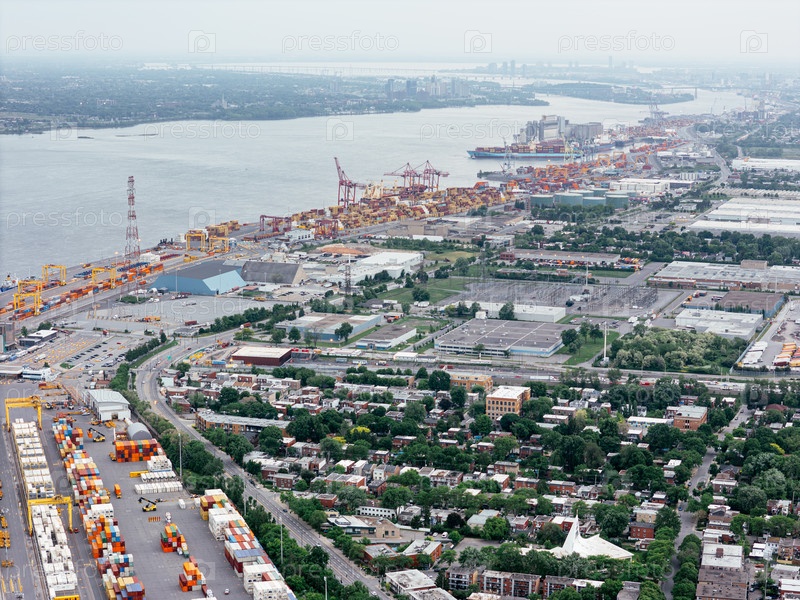 Вид с воздуха на порт Монреаля с грузовыми контейнерами, кранами и горизонтом города на закате. г
