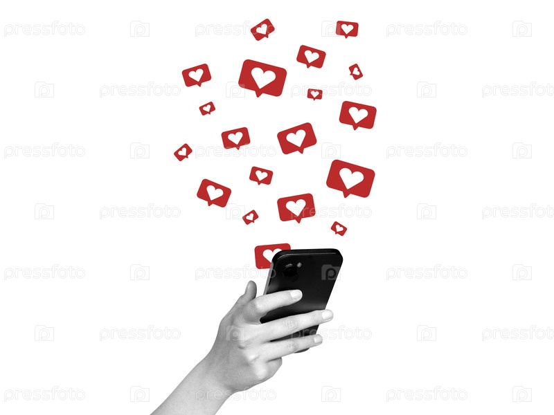 Современный коллаж. Рука держит телефон. Например. Реакция как. Медиапространство. Социальные сети. Коммуникационная концепция, общество. Икона в форме сердца. Издание новостей. Подписчики. Популярный блог. Блогинг